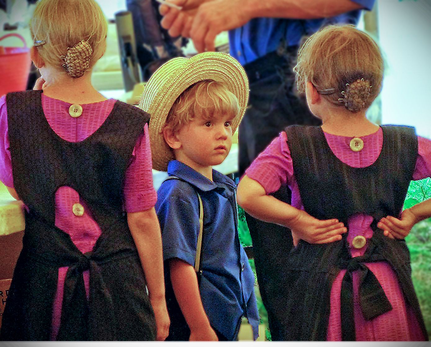 I got this at one of the “mud sales” near Lancaster PA a few years ago: Huge auctions to raise money for the local firefighters, attended by Amish and “English” [that’s us] equally. The Amish thing is so fascinating, and their children, dressed not like kids but as miniature adults, are even more so. Their interactions, like their lives, seem rooted in a different era.