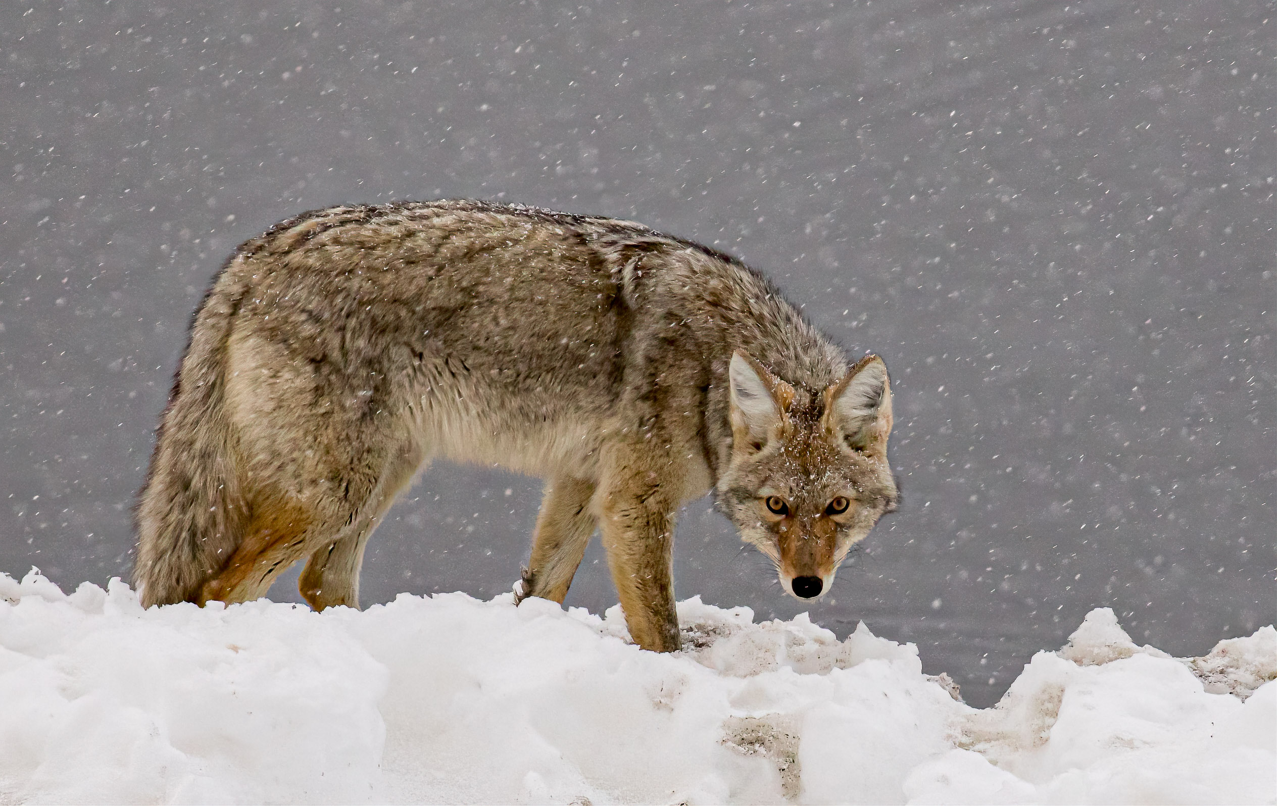 I shot this coyote from a van with a sunroof in Grand Teton NP, using a 400 mm lens and 1.4 extender on a 1.6 crop frame (Canon 7D). When we first saw him, he had just lost a fish to two eagles. At first he appeared perplexed, but this glare suggests that he was now just pissed.