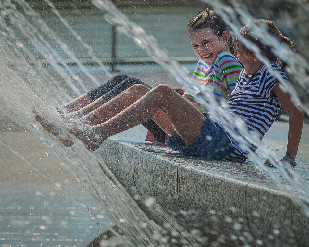 I took this photo in Georgetown on a warm October day. I experimented with different ways of capturing the water movement by changing up my shutter speed. Here the camera was at 1/400, which froze the action of the girls but blurred the water.