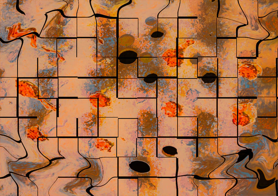 What began as a thick rusted metal plate having the circular holes and raised 1.5″ bumps (the Plugs from the holes) was cropped and processed in PS to become an abstract of odd color patterns overlaid with black hatch lines and then smeared a bit at the corners. Creating this abstract caused me to wonder the dimensions it must become to make a positive impact. Hopefully my choice of larger rather than smaller worked well.