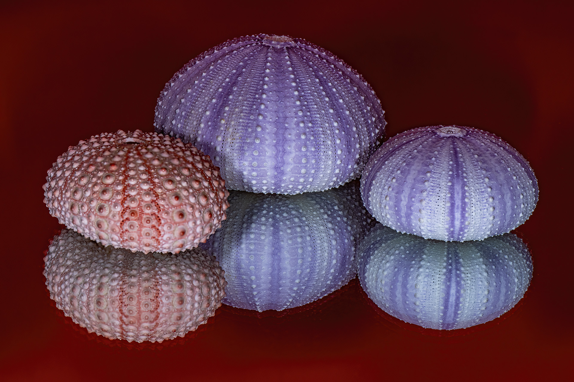 This image was shot in a light box with dark sides and a red paper inserted along the top and back. The sea urchin shells were not a matched set. Lining them up in a straight row was easier from a depth of field consideration, but the arrangement was too static so this clustering was chosen. The red background is unexpected and had the “made you look” effect. It gently enhanced the round shadows in the background—adding depth to the image. They would have been lost with a black background and too harsh with a white background. A more pastel background would not have had as much punch. The red background emphasized the red-orange shell points on the left urchin and helped create additional reflections in the foreground around the urchins—creating more interest for the eye without dragging one away from the subject.