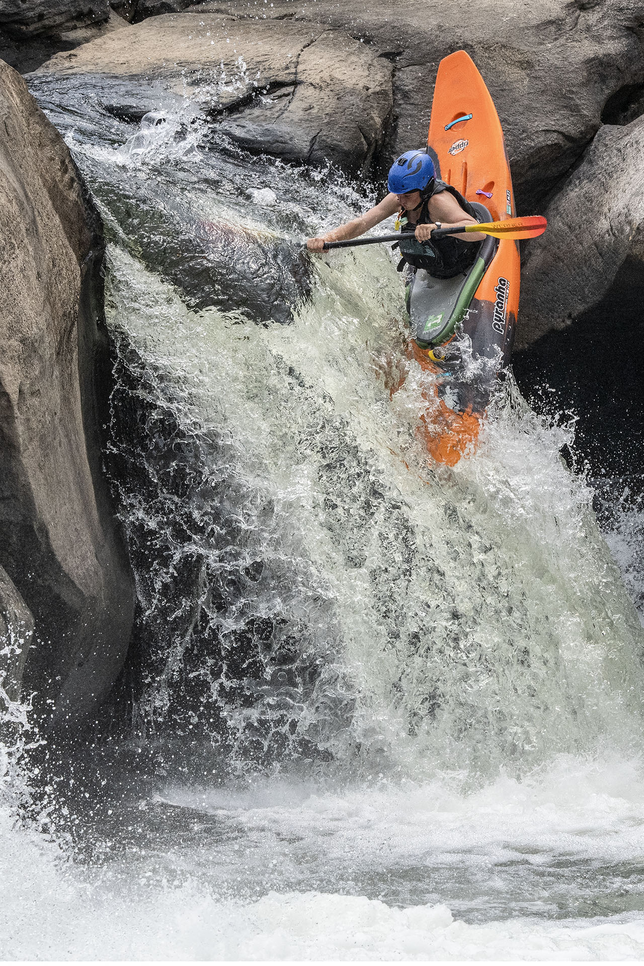 The Start of the Spin shows how the kayaker has entered the vertical portion of the drop and has inserted the paddle into the water on river right (going downstream) so as to initiate a turn that will drive the bow of the boat into the falls to make the first part of a spin with a spiral trajectory as the boat drops. The boat will complete the spin moving river left and then resume pointing down stream as the paddler reaches the base. This was captured in four shots—one before this one and two afterwards. The placement of the boat in the upper right of the picture accentuates the height and drama of the action to come. The orange color focuses the eye.