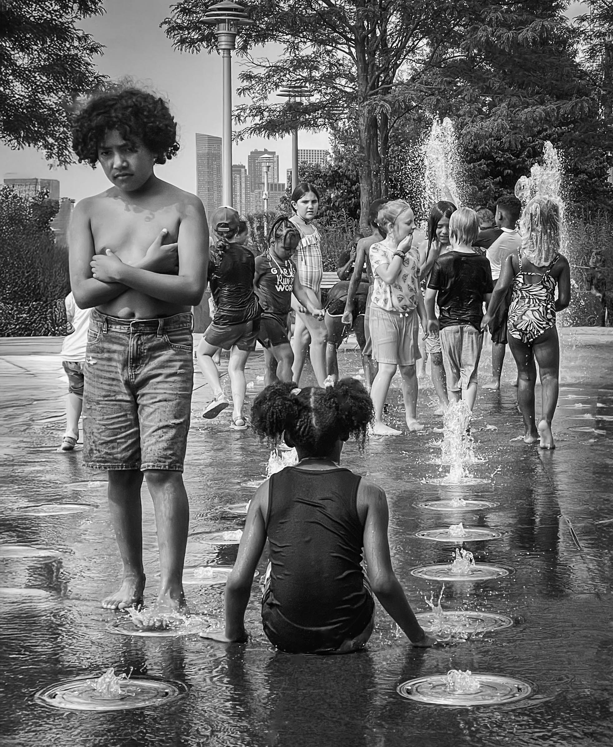 Perhaps derived from my love of the Georges Seurat painting, “A Sunday on La Grande Jatte #11” I am drawn to photographing groups (especially of children) engaged in what Developmental Psychologists call parallel play, i.e., activities governed by a single focus (playing in the fountains of a splash park), but not necessarily engaged in social interaction. Viewers are drawn into considering both the full environment, as well as the individual engagements of the participants. In this shot, taken in Brooklyn, NY, in the summer 2024, I was drawn to the harmony of these children enjoying their respite from the summer heat. The Brooklyn skyline is in the background.